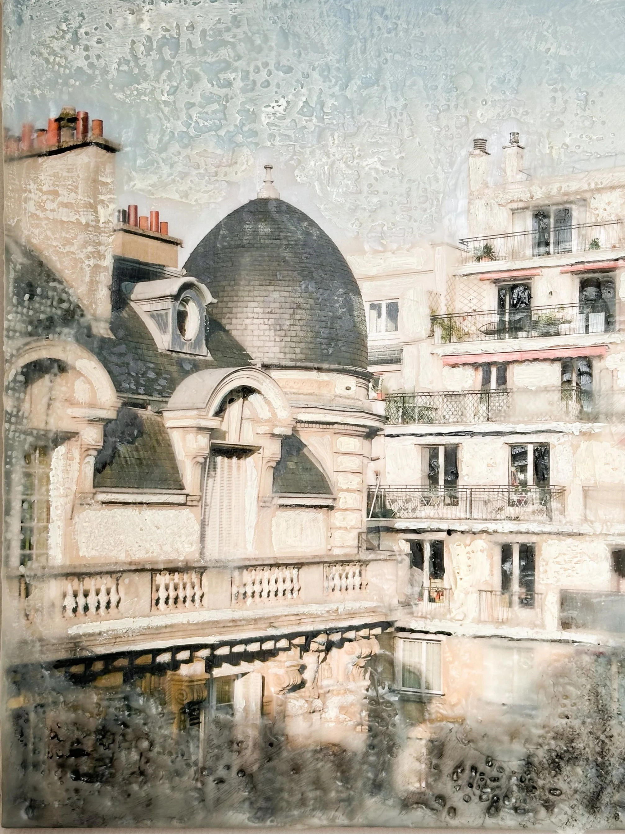 Blossoming trees, historic landmarks, late-afternoon sunlight, and quiet storefronts become memories suspended in wax. Photographed by Stephanie Court Toscano on medium format film while on a trip to France, the “Paris In Springtime” collection is a series of photo encaustic works that blur the boundary between photography and painting. With each layer of melted wax and oil paint, you are invited to experience Paris not just as it looks but also as it feels.